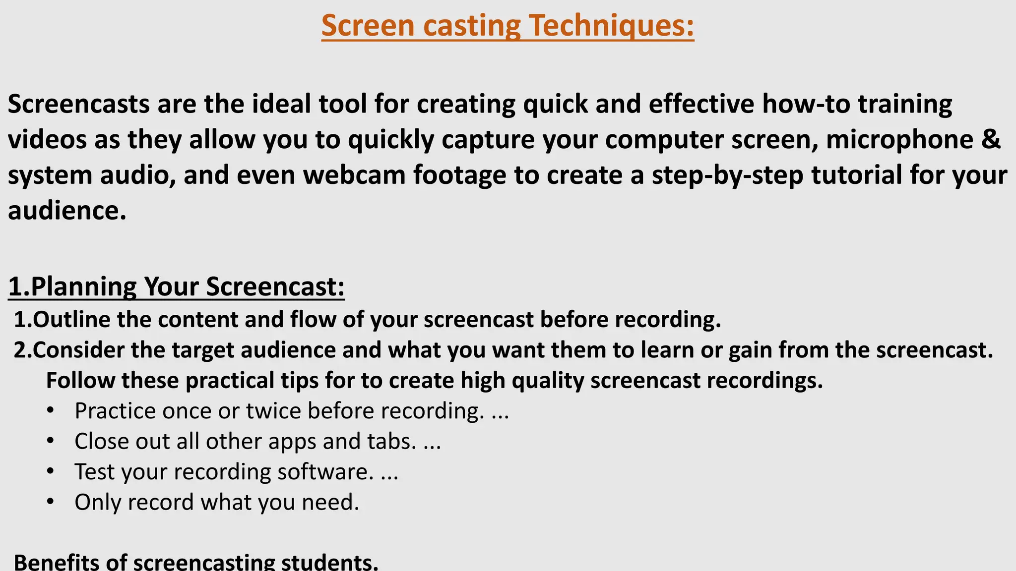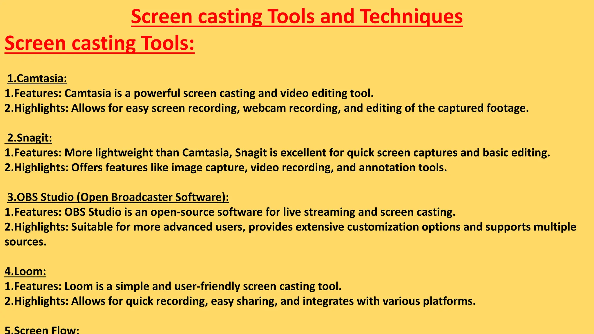 The document outlines various screen casting tools, including Camtasia, Snagit, OBS Studio, and Loom, highlighting their features and benefits for users. It emphasizes effective techniques for creating high-quality screencasts, such as planning, clear narration, effective visuals, and optimizing audio quality. The document also discusses the importance of sharing, receiving feedback, and using interactive elements to enhance viewer engagement.