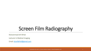 The document provides an overview of screen film radiography, detailing topics such as standard cassette sizes, radiographic film construction, and the process of forming a latent image. It emphasizes the interaction of x-rays with a radiographic intensifying screen and film, creating a visible image through processing. Additionally, the document covers the components and handling of radiographic film to maintain image quality.