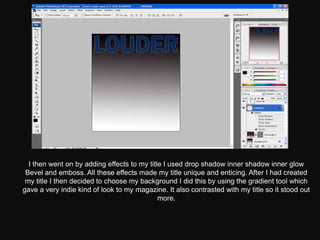 The document summarizes the process of designing a magazine cover in Adobe Photoshop. First, the designer created the title of the magazine using the font Franklin Gothic in size 50 in blue to stand out. A drop shadow and other effects were added to make the title unique. Next, a gradient background was chosen to give an indie look. In subsequent lessons, a friend was photographed holding a guitar to portray an edgy look, and text was added following the blue color scheme. Additional effects were applied to graphics and text to draw the reader in. Throughout the process, the designer experimented with colors and layouts to make the cover visually appealing and representative of the magazine's style.