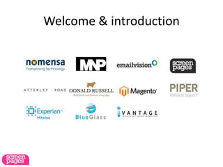 The document summarizes an e-commerce forum that will discuss trends, best practices, and case studies. It will include presentations on personalization, usability, fulfillment, search, content marketing, and platforms. There will also be a panel session and time for networking. Benchmark data from 14 retailers with £500k-£10m in online sales will be presented, including traffic sources, mobile usage, engagement rates, and which sources most effectively drive conversions.