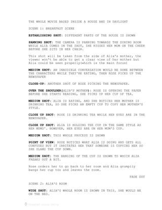 The document outlines the scenes and shots planned for the film "Tiny Minds". It follows a day in the life of Alia as she copies her mother's mannerisms at breakfast, leading to an argument. Later, Alia is stealing her mother's possessions and hiding them. The film ends on a cliffhanger as Alia's mother catches her dressing up in her clothes. The document provides detailed descriptions and purposes of establishing shots, medium shots, close-ups, and point-of-view shots to depict the scenes and advance the story between Alia and her mother.