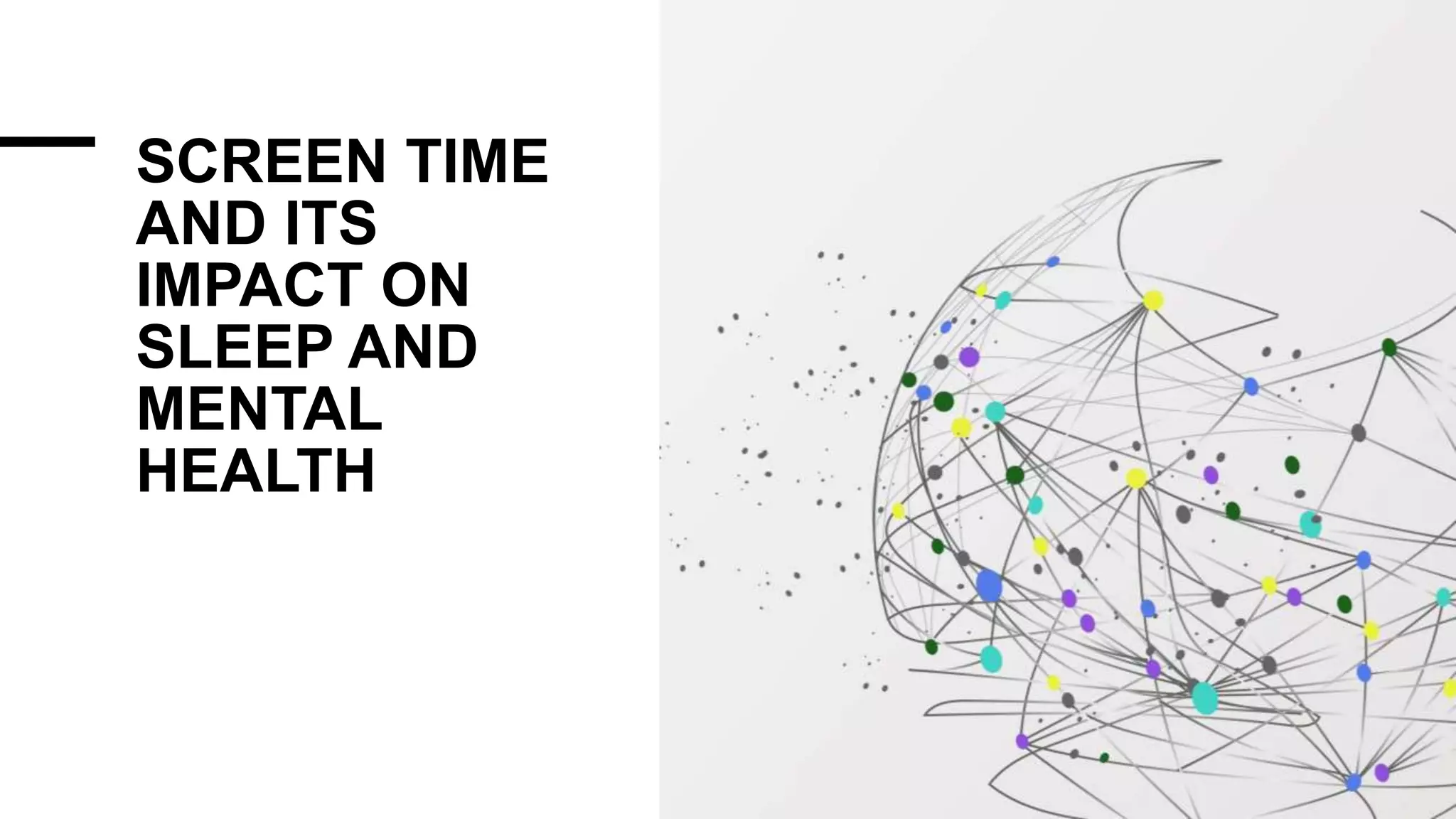 This document discusses the impacts of excessive screen time on sleep and mental health. It notes that on average students spend over 3.5 hours on their phone and 3 hours on their computer per day. Most experts recommend limiting screen time to less than two hours daily. The document also discusses how screen notifications can increase stress and feelings of compulsion to check devices. Excessive screen time is linked to greater social anxiety and depression. Over 85% of students go to sleep directly after screen use, but experts recommend at least 30 minutes of no screen time before bed to improve both sleep quantity and quality.