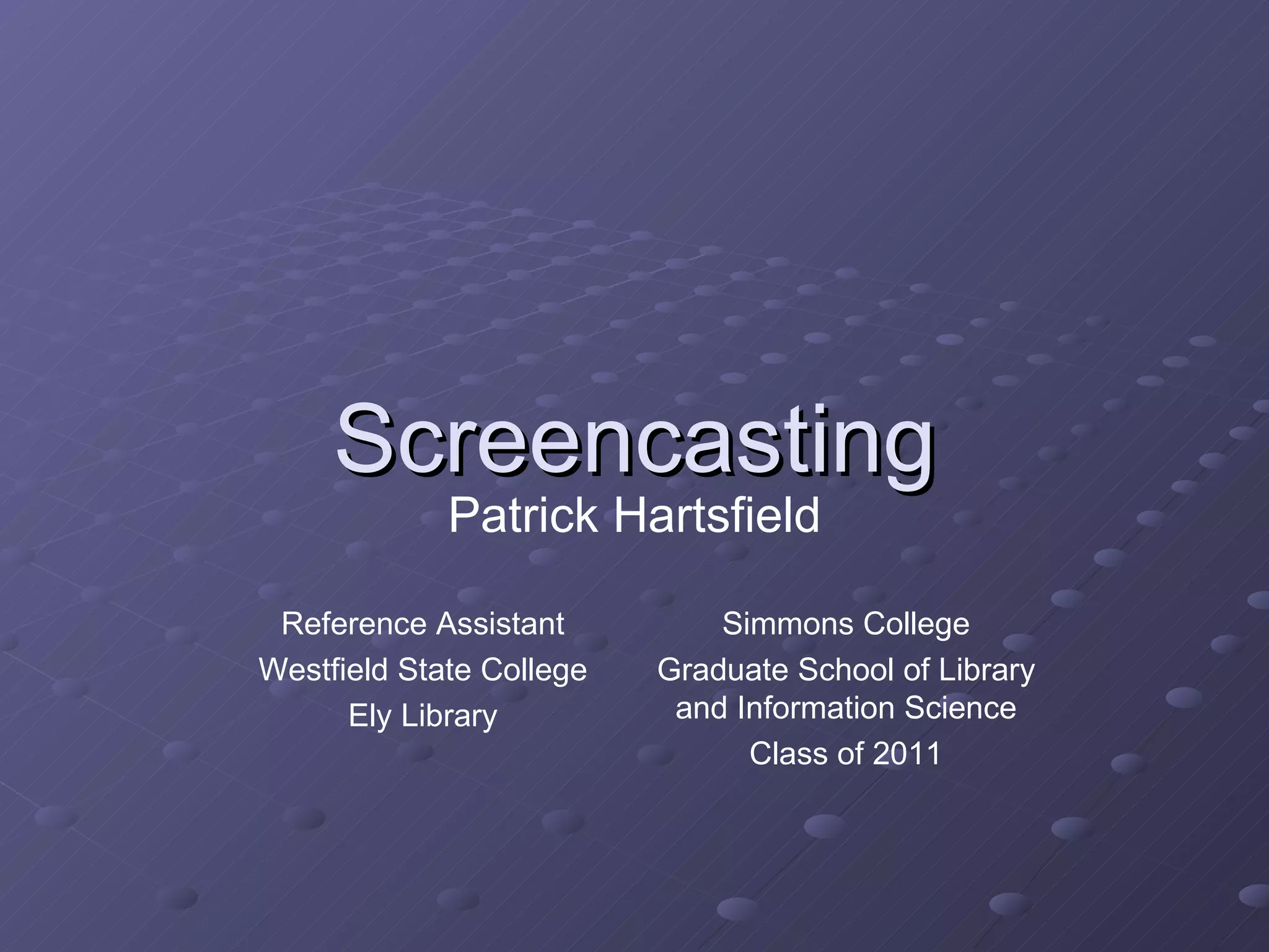This document provides an overview of screencasting, including what it is, why its popularity has increased, common uses, available software programs, and best practices. Screencasting allows for video recording of one's computer screen and is useful for creating tutorials, lectures, demonstrations, and FAQs. It has become more widespread due to increased computing power, storage, and internet speeds, as well as accessible software. The basic process involves dry running and storyboarding tasks, scripting, recording both video and separate audio, editing the recordings together, and distributing the final screencast. Best practices include keeping recordings brief, focusing on one task at a time, speaking clearly, and making the screencast easy for others to view and