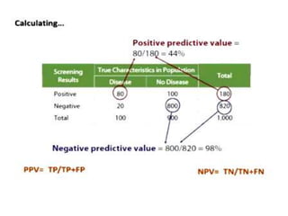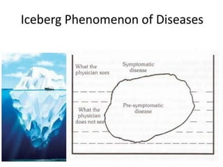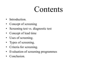 The document discusses screening for diseases. It defines screening as actively searching for unrecognized disease among apparently healthy people using tests or examinations. The goals of screening are to detect disease early when treatment can be most effective and to sort people into those who need medical follow up and those who do not. Key aspects discussed include the difference between screening and diagnostic tests, criteria for effective screening such as diseases amenable to screening, accurate and reliable screening tests, and evaluating screening programs.