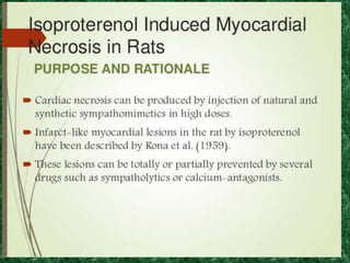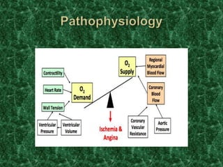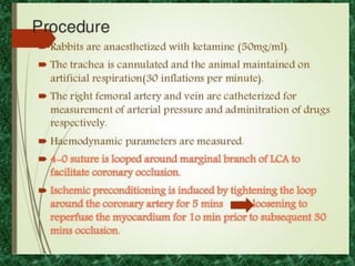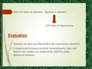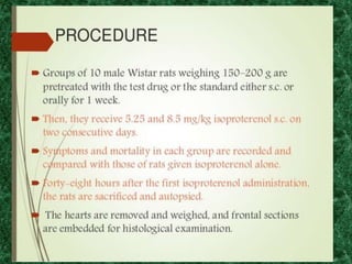Screening methods for anti-anginal agents include in vivo and in vitro models. In vivo models involve inducing ventricular failure in animals through repeated injections of plastic microspheres into the left ventricular artery. In vitro models screen agents using isolated tissues like heart muscle to assess effects on coronary blood flow, oxygen consumption, and mechanical activity. Common classifications of anti-anginal agents are nitrates, beta-blockers, calcium channel blockers, potassium channel openers, and others like dipyridamole and trimetazidine.