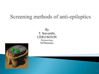 This document summarizes various preclinical screening methods used to evaluate potential anti-epileptic drugs. It describes several animal models of induced seizures including electroshock seizures, chemical-induced seizures using pentylenetetrazol or picrotoxin. It also discusses genetic models like the totterer mouse that is prone to spontaneous seizures. The key methods are maximal electroshock in mice/rats to test generalized tonic-clonic seizure protection and the pentylenetetrazol test in mice to assess anticonvulsant effects against petit mal-like seizures. These preclinical tests aim to predict potential efficacy of new compounds before clinical trials in humans.
