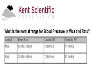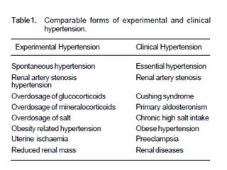 This document discusses preclinical screening methods for antihypertensive agents using animal models of hypertension. It describes several animal models that mimic different types of human hypertension, including renovascular hypertension induced by clipping the renal artery, dietary hypertension from high salt intake, and genetic hypertension using spontaneous hypertensive rats. The ideal animal model criteria are outlined as well as common methods for measuring blood pressure directly via catheterization or indirectly via tail-cuff. The effects of different classes of antihypertensive drugs are also reviewed.
