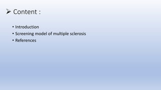 This document discusses the screening models for multiple sclerosis (MS), an immune-mediated inflammatory disease that leads to significant physical disability. It explores various in-vitro and in-vivo models used to study MS, including microglia cultures and experimental autoimmune encephalomyelitis (EAE). The document also details viral and toxin models that induce demyelination, highlighting the mechanisms involved and referencing key literature.