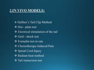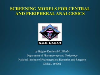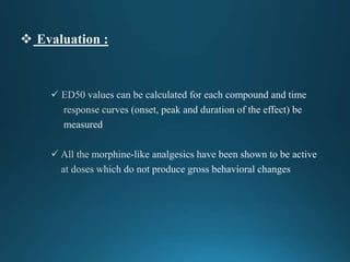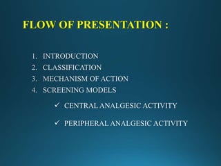 This document describes screening models used to test central and peripheral analgesic activity. For central analgesic activity, it discusses the hot plate test, grid-shock test, and tail immersion test which measure response latency to a painful stimulus. For peripheral analgesic activity, it discusses the writhing test which counts stretching behaviors in mice after an irritant injection, and the Randall-Selitto test which applies pressure to inflamed tissue in rats to measure pain threshold changes.