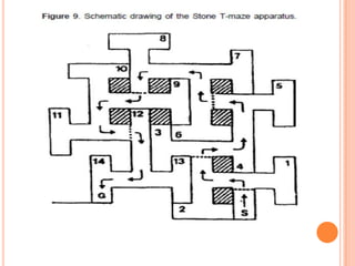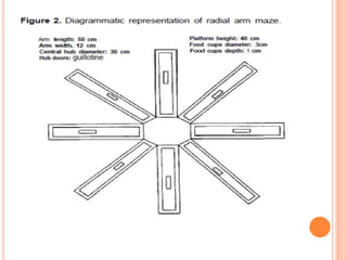 The document summarizes screening procedures for amnesia that are used in laboratory animals. It describes various behavioral models to study drugs or conditions that affect cognitive processes, including discrimination learning tasks like the Morris water maze, radial arm maze, Y-maze, and avoidance behavior tasks like the three-panel runway apparatus and elevated plus maze. It also discusses methods used to induce amnesia in experimental animals for research purposes, such as drug-induced state dependent learning, electroshock, and brain lesions. The goal of screening procedures is to test potential treatments for amnesia.