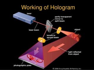 A display is a surface that shows visual information such as text or graphics. Traditional displays use screens, but screenless displays project images directly onto the eyes or brain without an intermediate screen. Examples of screenless display technologies include holograms, head-mounted displays like Google Glass, and retinal displays that project directly onto the retina. Future screenless displays may transmit visual information directly to the brain through brain-computer interfaces.