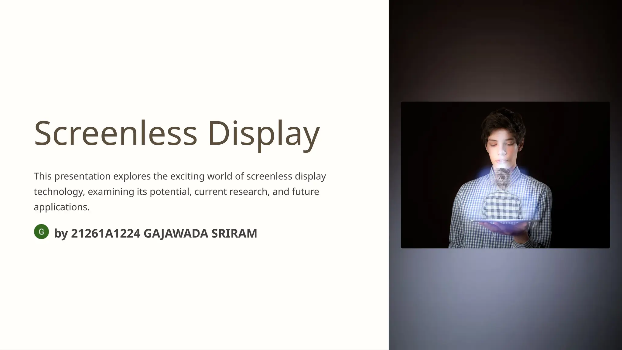 This document explores screenless display technology, which projects visual information directly onto the user's environment using methods like holography and retinal projection. It discusses various applications across fields such as entertainment, education, and healthcare, highlighting advantages like reduced size, enhanced privacy, and immersive experiences. The presentation also surveys existing literature and outlines future possibilities for this innovative technology.