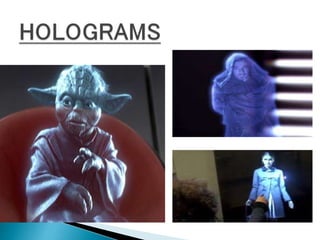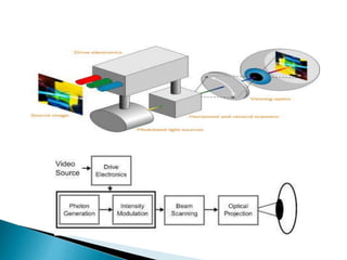 Screenless display technology aims to transmit information without traditional screens or projectors, divided into three categories: visual image, retinal direct, and synaptic interface. Notable advancements include hologram technology used in telecommunication and the potential for future implementations directly to the brain. Ongoing research by leading companies and laboratories is focused on enhancing the capabilities, portability, and efficiency of screenless displays.