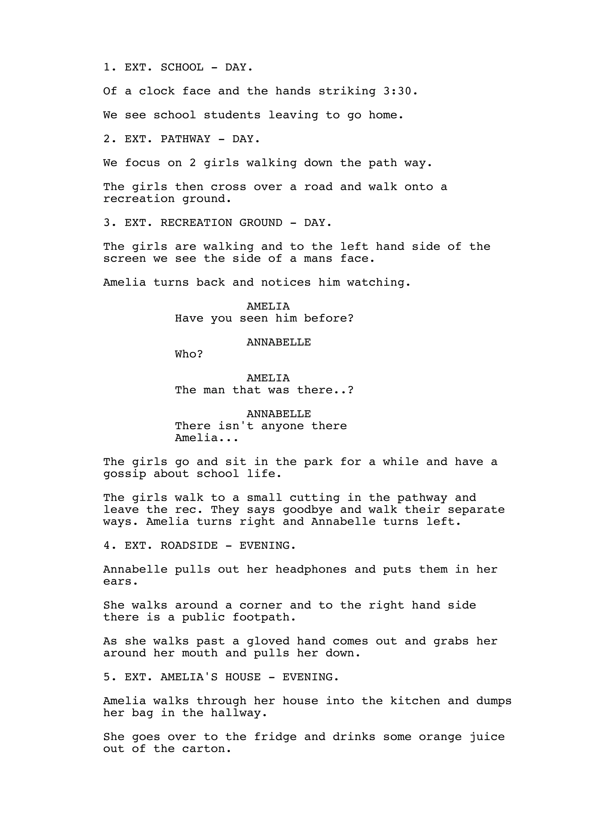 1. School ends at 3:30pm and two girls, Amelia and Annabelle, walk home together through the recreation ground. Amelia notices a man watching them but Annabelle doesn't see anyone.