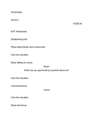 The screenplay depicts a scene at a restaurant where Bryan asks his girlfriend Leena when she will tell her parents about their relationship. Leena is hesitant as her parents want her to focus on her studies. They plan to have their mothers meet by pretending to bump into each other at the mall. The next scene shows Bryan at home, where his mother reminds him of plans they have the next day. That evening, Bryan gets into trouble for texting while driving and accidentally hits a girl walking along the road.