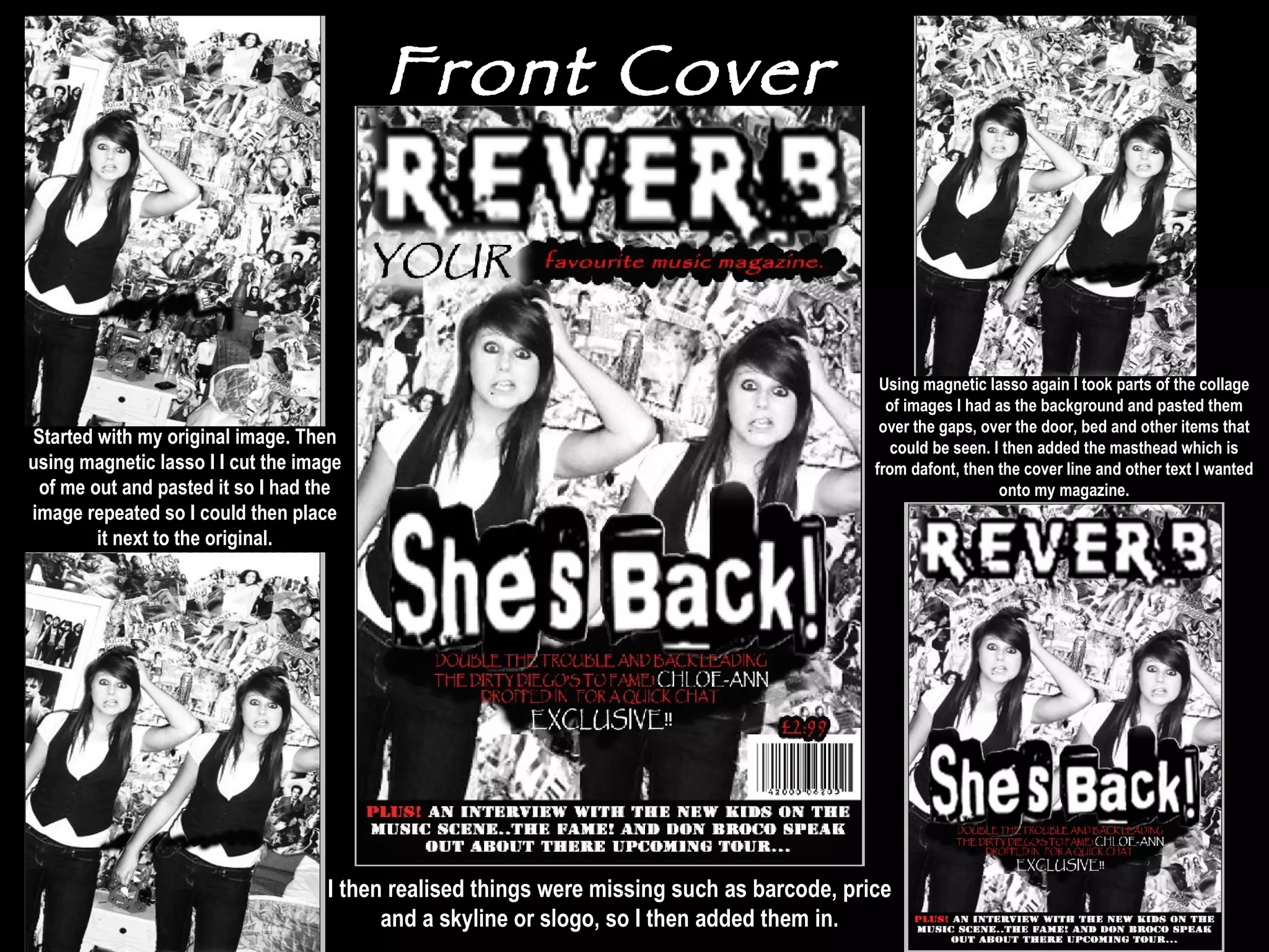 The document provides screenshots and descriptions of the steps taken to create the front cover, contents page, and double page spread (DPS) of a magazine. For the front cover, the creator cut out an image and repeated it, then added background images, text, and additional elements. For the contents page, a black and white main image was used against colored thumbnail images to stand out. Images and text were incorporated. For the DPS, the main image was placed and additional supporting images and text boxes were added, along with article text, to pull the spread together visually and thematically.