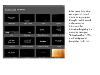 After conducting interviews, the group imported the recordings into iMovie to organize them and add titles like "Interview One". They used background templates to introduce each interview. Screenshots show how the group imported recordings from Photo Booth into iMovie, arranged them on the timeline, and played back the final production to check for errors.