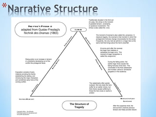 The document provides an overview of narrative story structure techniques including:
