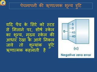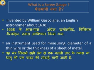 This document discusses the parts of a screw gauge and how to use one. It identifies the main parts as the pitch scale, ratchet, circular scale, and anvil. It explains that the pitch scale measures the distance the screw travels and the circular scale helps determine measurements smaller than the scale's divisions. When using a screw gauge, the reading is taken as the linear scale reading plus the coinciding circular scale reading multiplied by the least count. The document also covers zero error and how to perform measurements with a micrometer screw gauge.