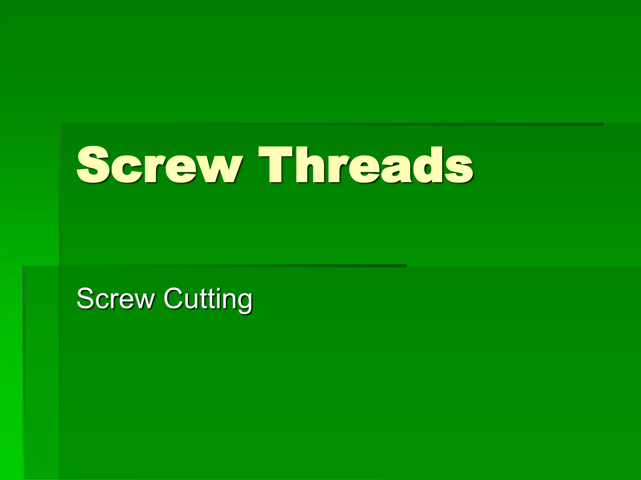 The document discusses different types of screw threads including Vee threads, buttress threads, square threads, and trapezoidal threads. It also covers screw thread terminology such as pitch, lead, and starts. Additionally, it describes methods of screw cutting including how to calculate the number of starts and testing threads using methods such as a test nut, thread calipers, or three wire method. Tracking ratios and various methods for tracking threads are also outlined.