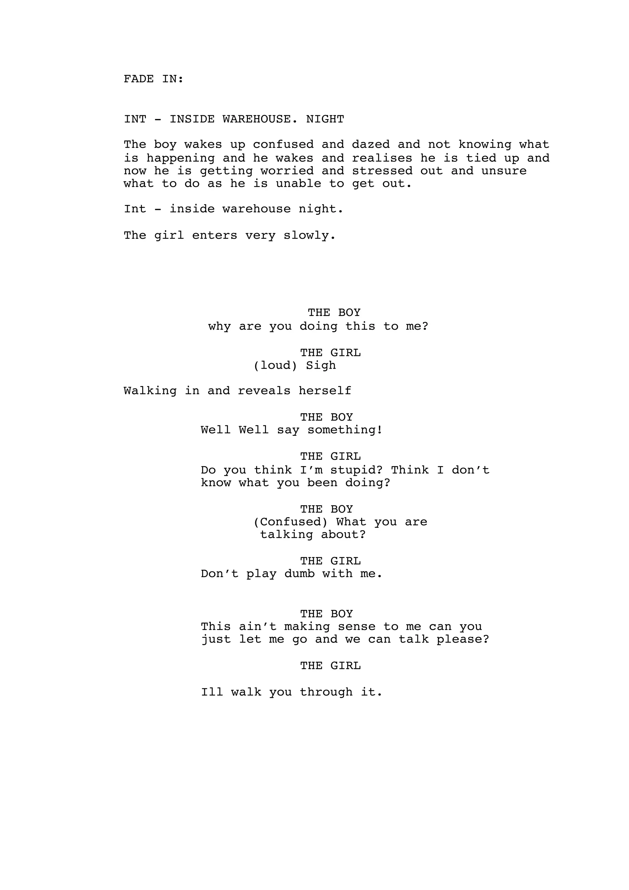 A boy wakes up tied up and confused in a warehouse. The girl who brought him there confronts him, accusing him of misleading her. She explains that she has been catfishing him to get revenge. Flashbacks show how she drugged him on a date and kidnapped him. When he angrily denies her accusations, she pulls out a knife, planning to hurt him. His panicked apologies are cut off by his screams as she uses the knife.