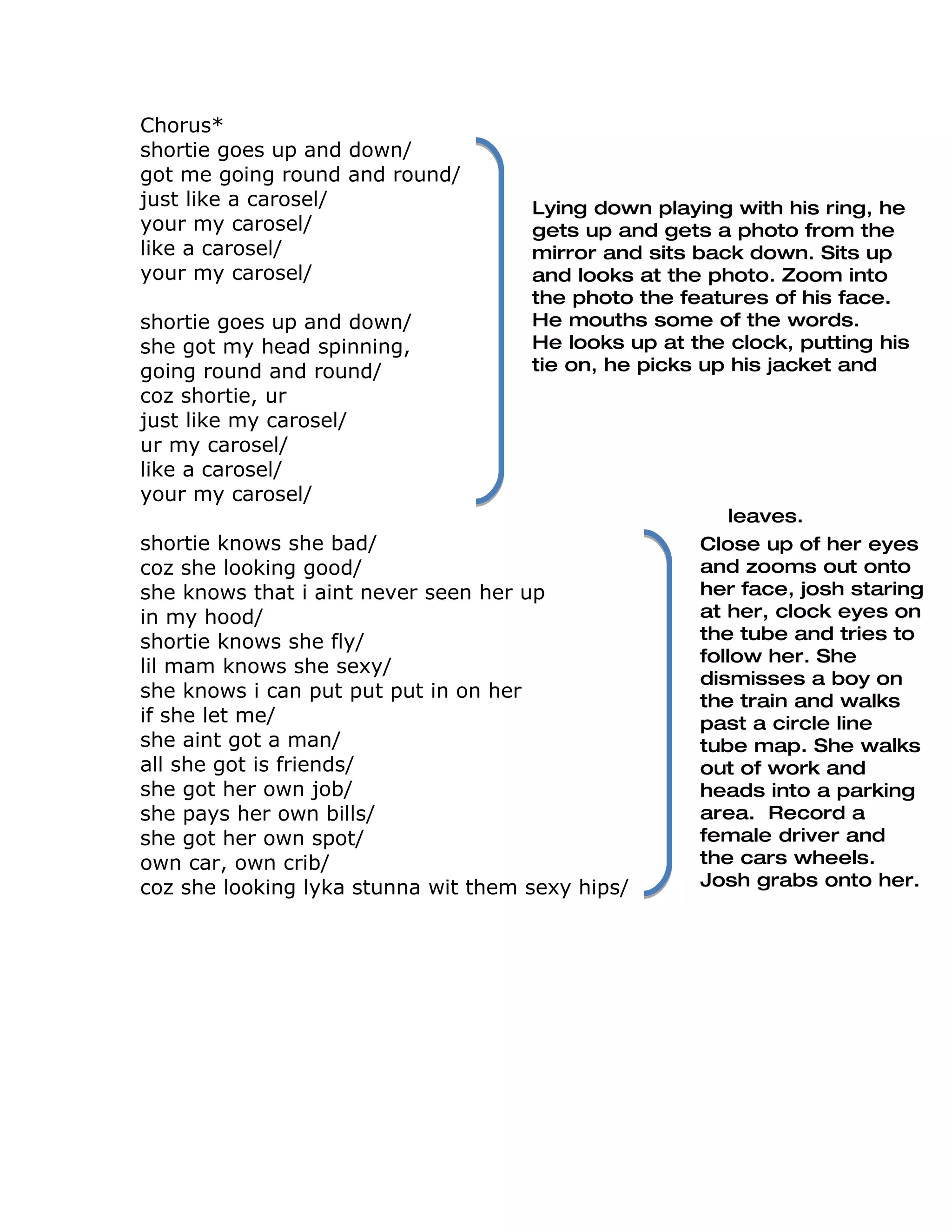 The document describes a man reminiscing about a woman. He lies down looking at a photo of her and mouths words to the song. He gets ready and leaves, putting on his jacket. Scenes then show the woman walking, ignoring men who try to talk to her. The man is shown dancing and singing, thinking about the woman. At the end he is sitting alone, playing with his ring until it falls on the floor.