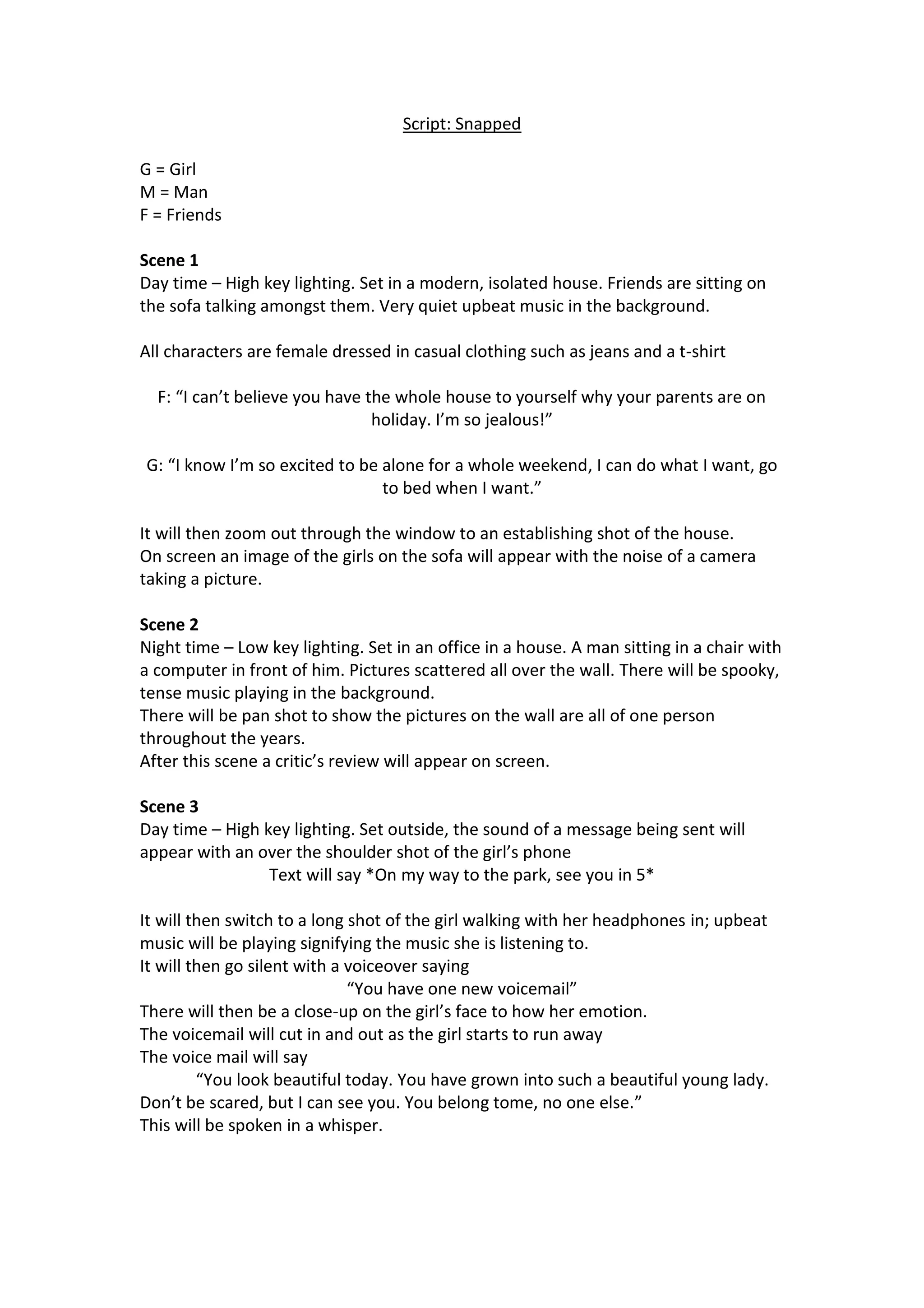 This document provides a scene-by-scene summary of a script for a thriller film titled "Snapped". The summary includes:
