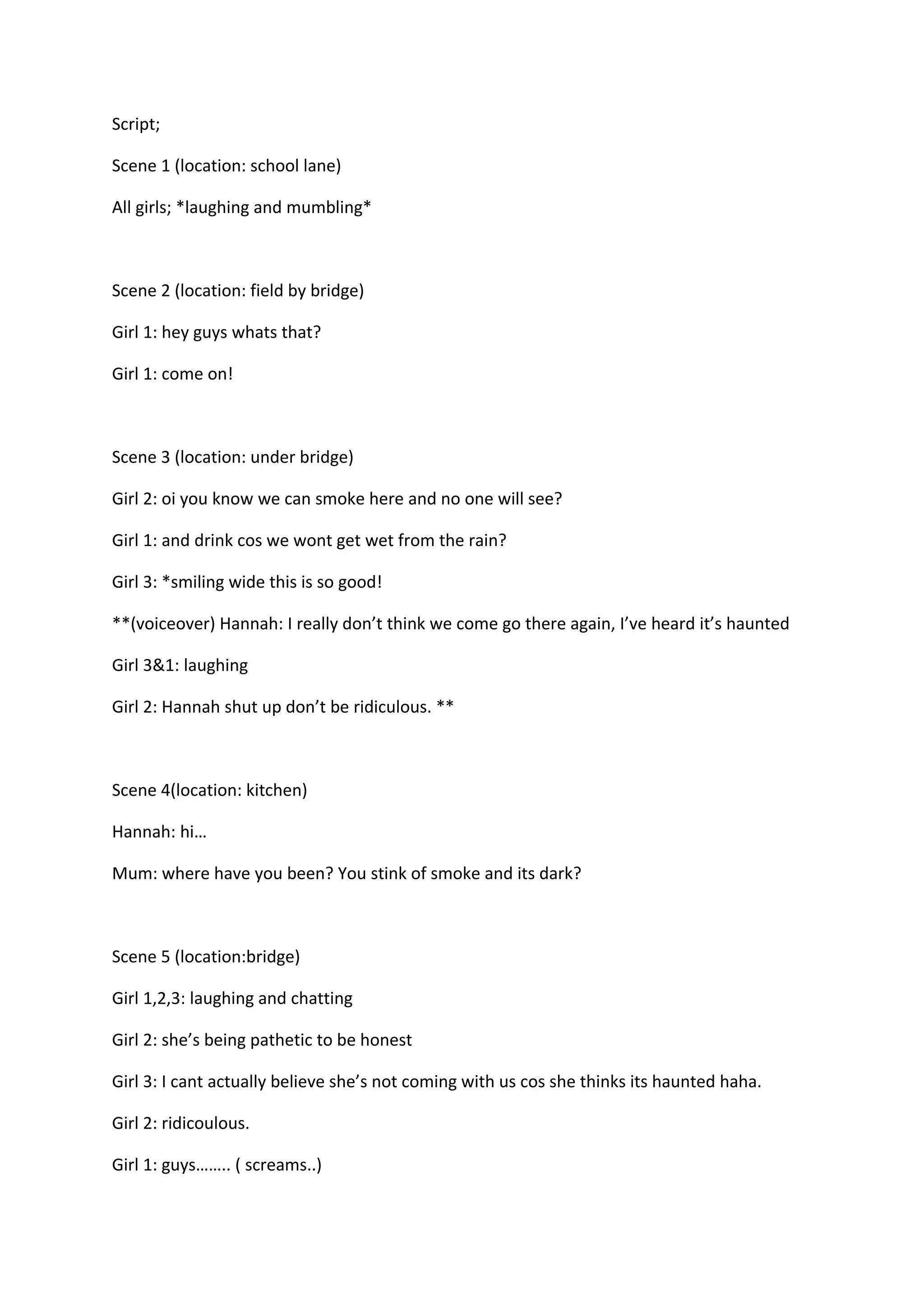 Girls go to a bridge to smoke and drink, but Hannah believes the area is haunted and does not join. She gets in trouble with her mother for coming home late smelling of smoke. The other girls make fun of Hannah for believing the bridge is haunted. At the bridge again, one of the girls screams. Hannah tries to warn others that the ghost is real and will kill those who do not believe.
