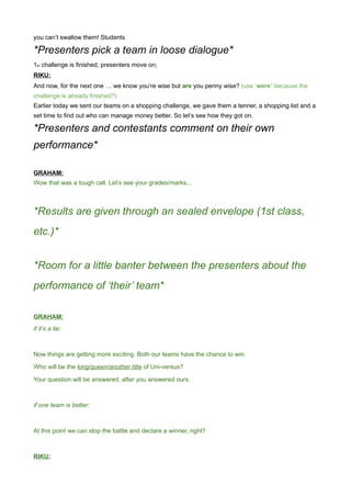 1) The document outlines a proposed game show format called "Uni-Versus" where students and lecturers compete in academic challenges.