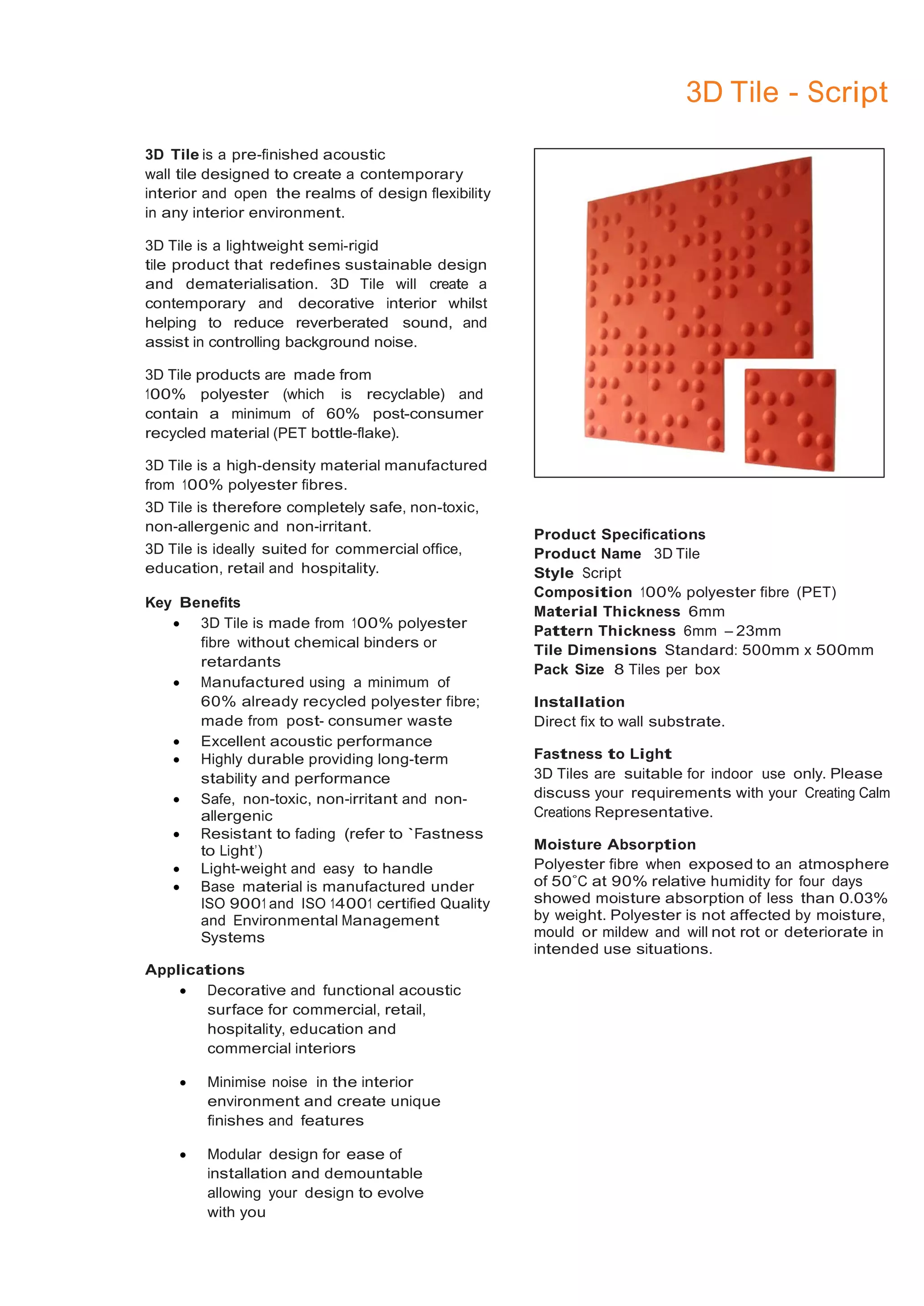 3D Tile is a lightweight, modular acoustic wall tile made from 100% recycled polyester fibers. It is designed to create contemporary interior spaces while reducing noise through sound absorption. Key benefits include being safe, durable, and sustainable as it contains a minimum of 60% post-consumer recycled material. 3D Tile is suitable for commercial, retail, hospitality, and education spaces to minimize noise and allow for decorative, customizable interior designs.