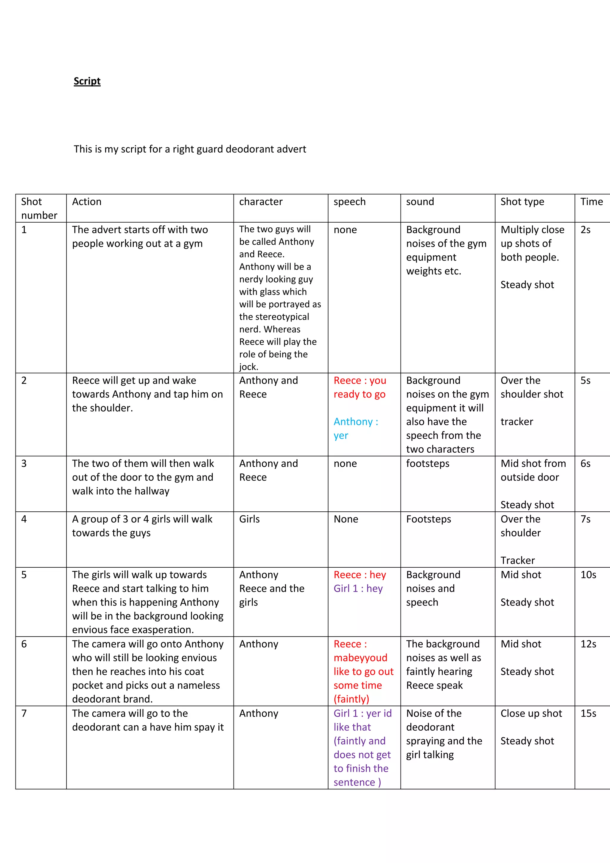 This document contains a script for a deodorant advertisement. It outlines 12 shots showing two men, Anthony and Reece, working out at the gym. Reece attracts the attention of some girls while Anthony looks envious. Anthony uses a generic deodorant but the girls are drawn to Reece when he uses Right Guard deodorant. The advertisement suggests Right Guard is the best deodorant to attract others.
