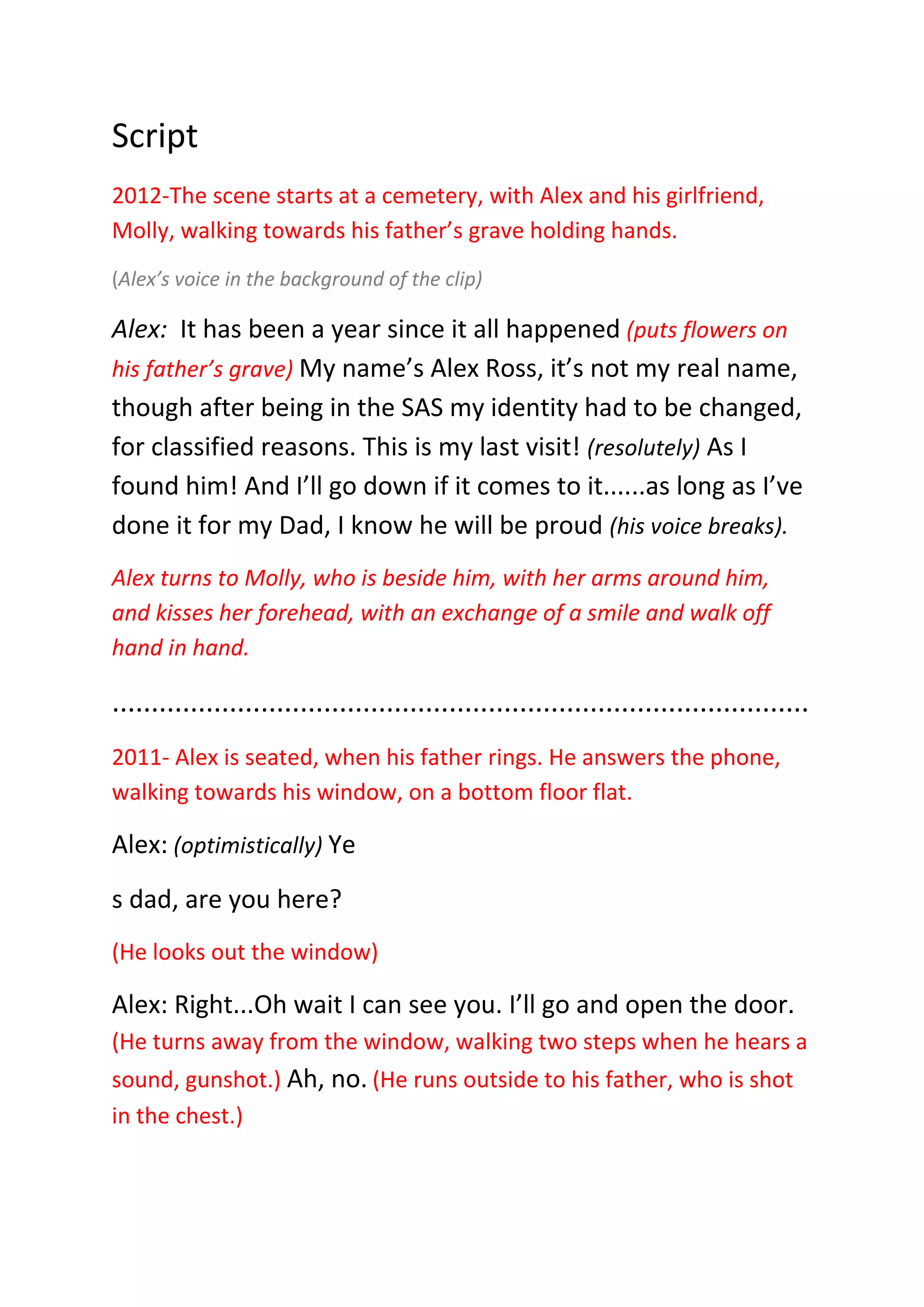 Alex visits his father's grave on the anniversary of his death with his girlfriend Molly. Alex reflects on finding his father's killer and being willing to go down for revenge. The scene then flashes back to a year earlier, where Alex's father calls him to open the door but is shot dead on the doorstep moments later. Alex finds his father and breaks down in grief as Molly calls for an ambulance.