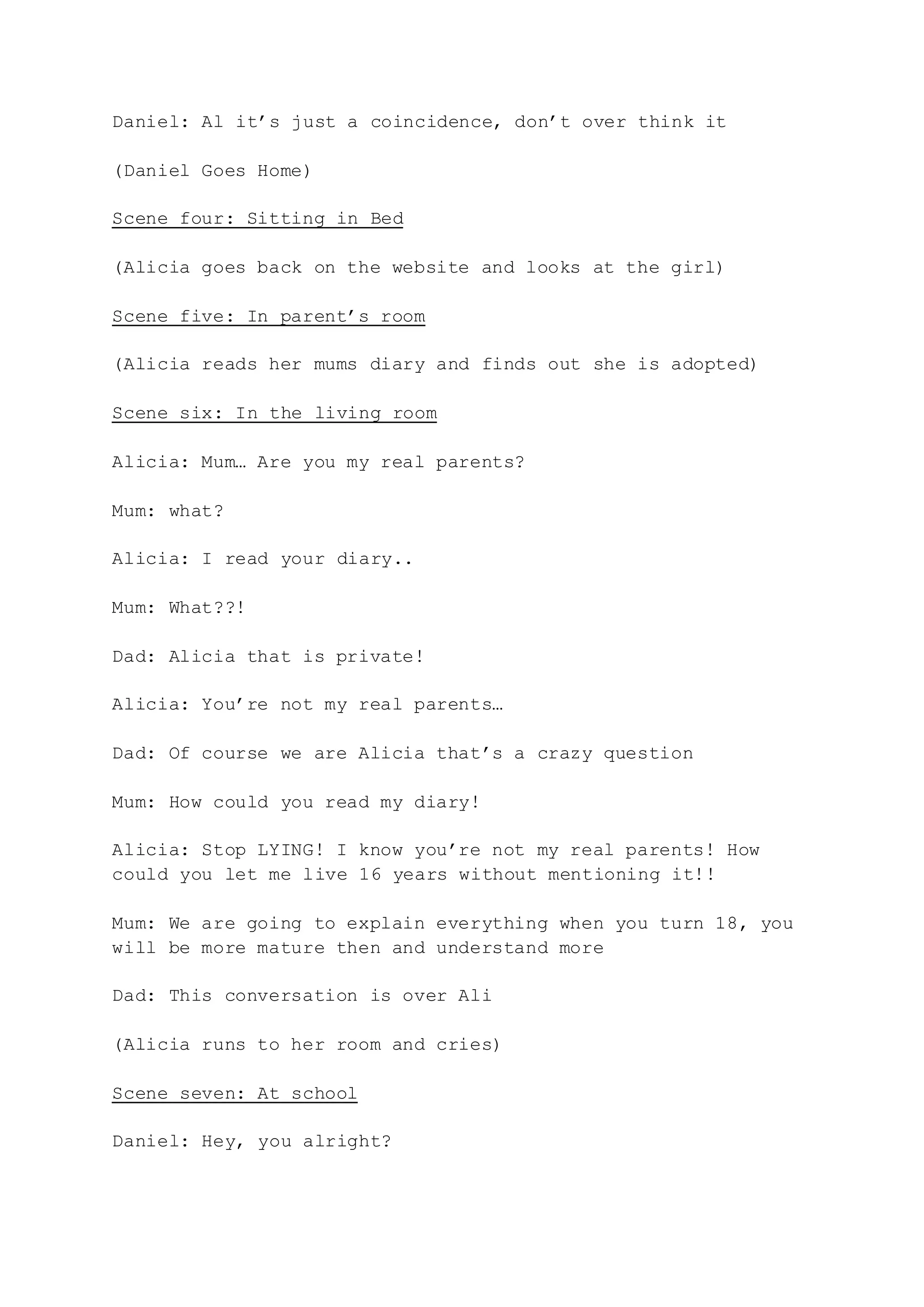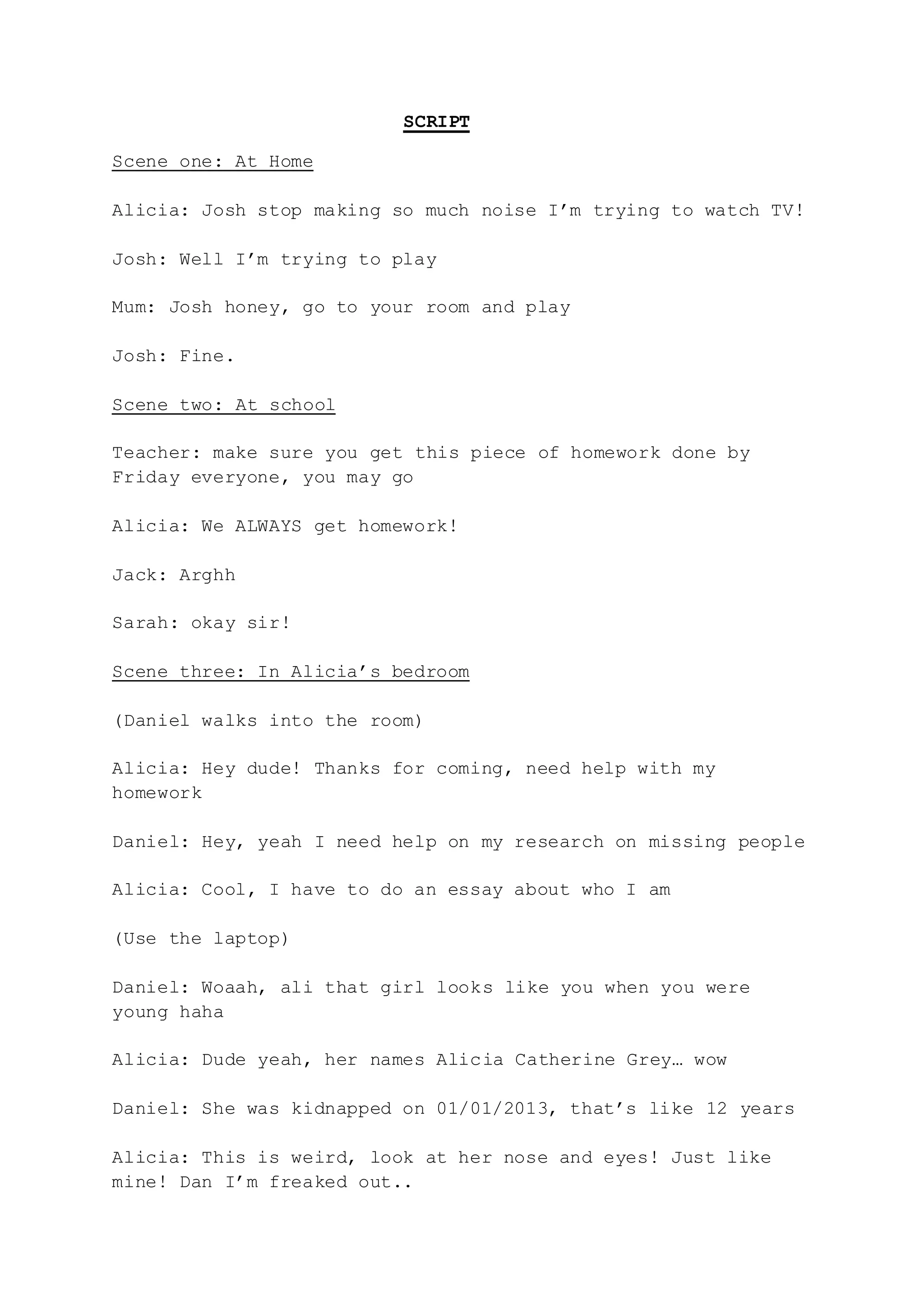 The document is a script that tells the story of Alicia discovering she was adopted after finding a missing person's report of a girl who looks just like her as a child. She confronts her parents who refuse to tell her about her birth parents. With Daniel's help, Alicia searches for information about her past and birth parents. However, their search attracts the attention of Jenny, the woman who originally kidnapped Alicia as a child. Jenny kidnaps both Alicia and Daniel, revealing that she has been watching Alicia for years. The script ends with Alicia and Daniel finding Alicia's birth parents.
