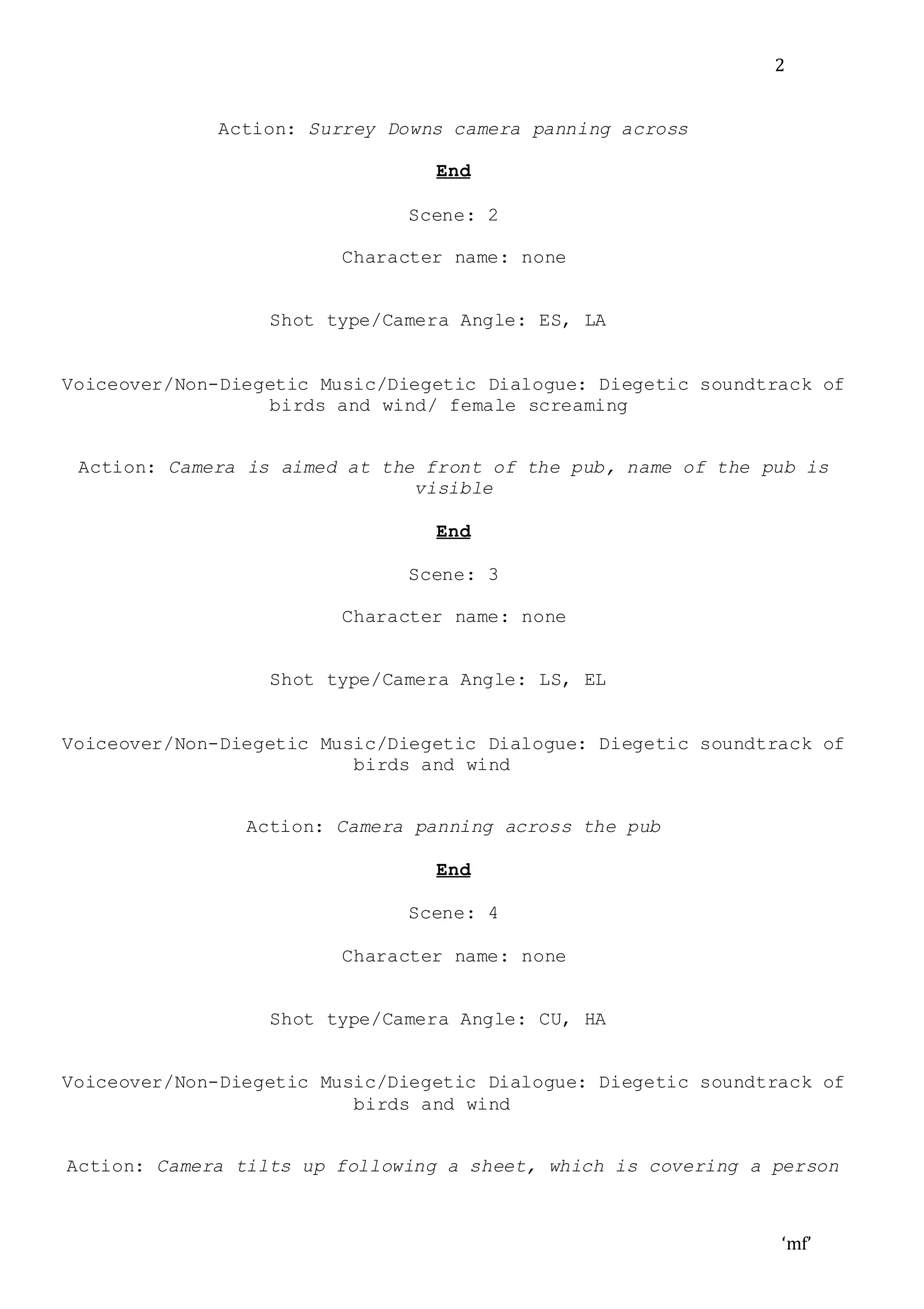 This document contains a script for a television production titled "Surrey Downs". It includes 24 scenes with descriptions of characters, camera shots, angles, and soundtrack details. The script opens with scenic shots of Surrey Downs and a pub, then introduces the character Dwane getting ready in front of a mirror with blood on his hands. Subsequent scenes depict a couple on a sofa being watched, a bloody knife, and messages on a phone about the character Abbie. It builds intrigue around who may have killed Abbie before closing with promotional text for the new soap opera.