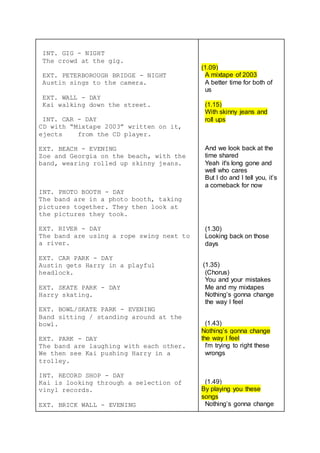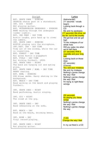 This document appears to be a script or storyboard for a music video or film. It provides locations and brief descriptions of scenes involving a band and their friends at various outdoor locations like beaches, forests, skate parks, and underpasses. The scenes show the band performing, rehearsing, hanging out, playing sports, and travelling together in a car. An accompanying song lyrics section suggests the video or film is telling a story through music about memories, mistakes, and looking back on past times.