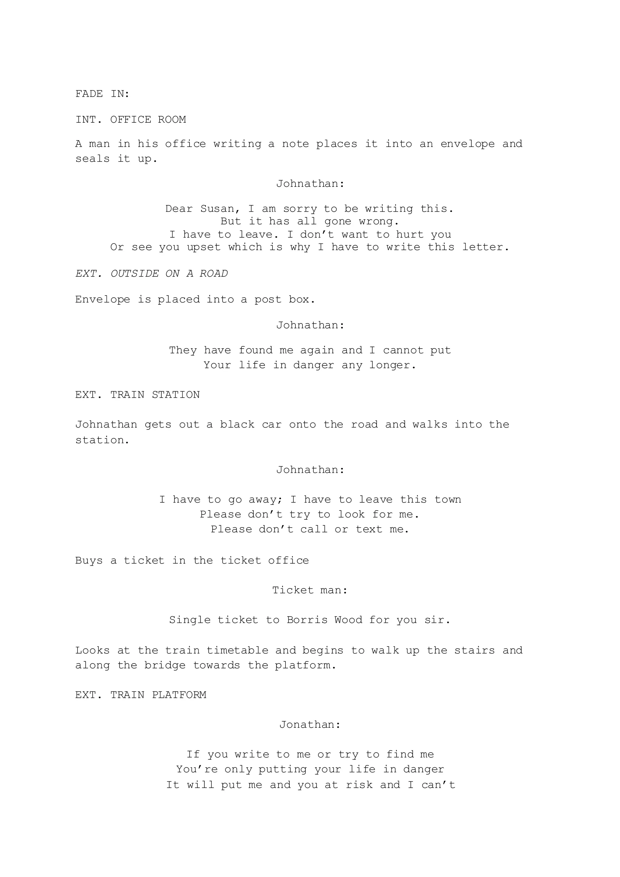 Johnathan writes a letter to Susan explaining that he has to leave town suddenly and cannot see her or put her life in danger. He places the letter in a post box and takes a train, hoping to protect Susan from unspecified threats. On the train platform, Johnathan tells Susan not to look for him or contact him through calls or texts as that could put them both at risk. He says he has to go away for an unknown period of time but hopes Susan will be happy, even if she finds someone new, and asks her not to forget about him, signing off with "All my love."
