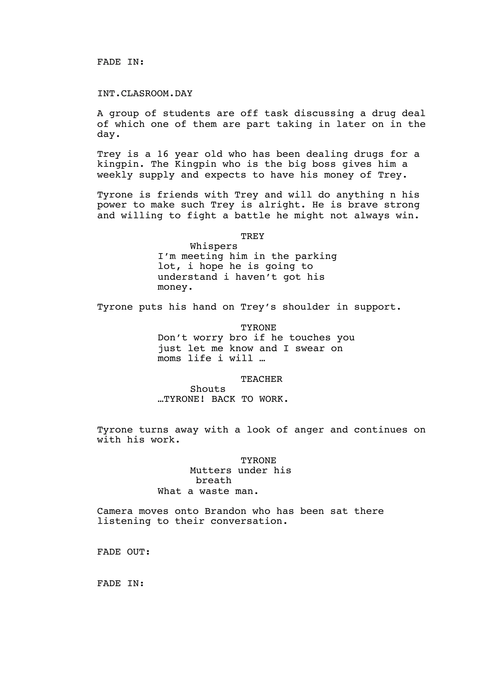 Trey is a 16-year-old drug dealer who owes money to his kingpin boss. At school, Trey tells his friend Tyrone that he is meeting the kingpin but does not have the money. Later, at the parking lot meeting, the kingpin shoots Trey for not having the money. Tyrone receives a text about the shooting from Brandon and rushes to the scene. A shootout ensues between Tyrone and the kingpin's guards, during which the kingpin is shot. Tyrone threatens the kingpin further before the scene ends.