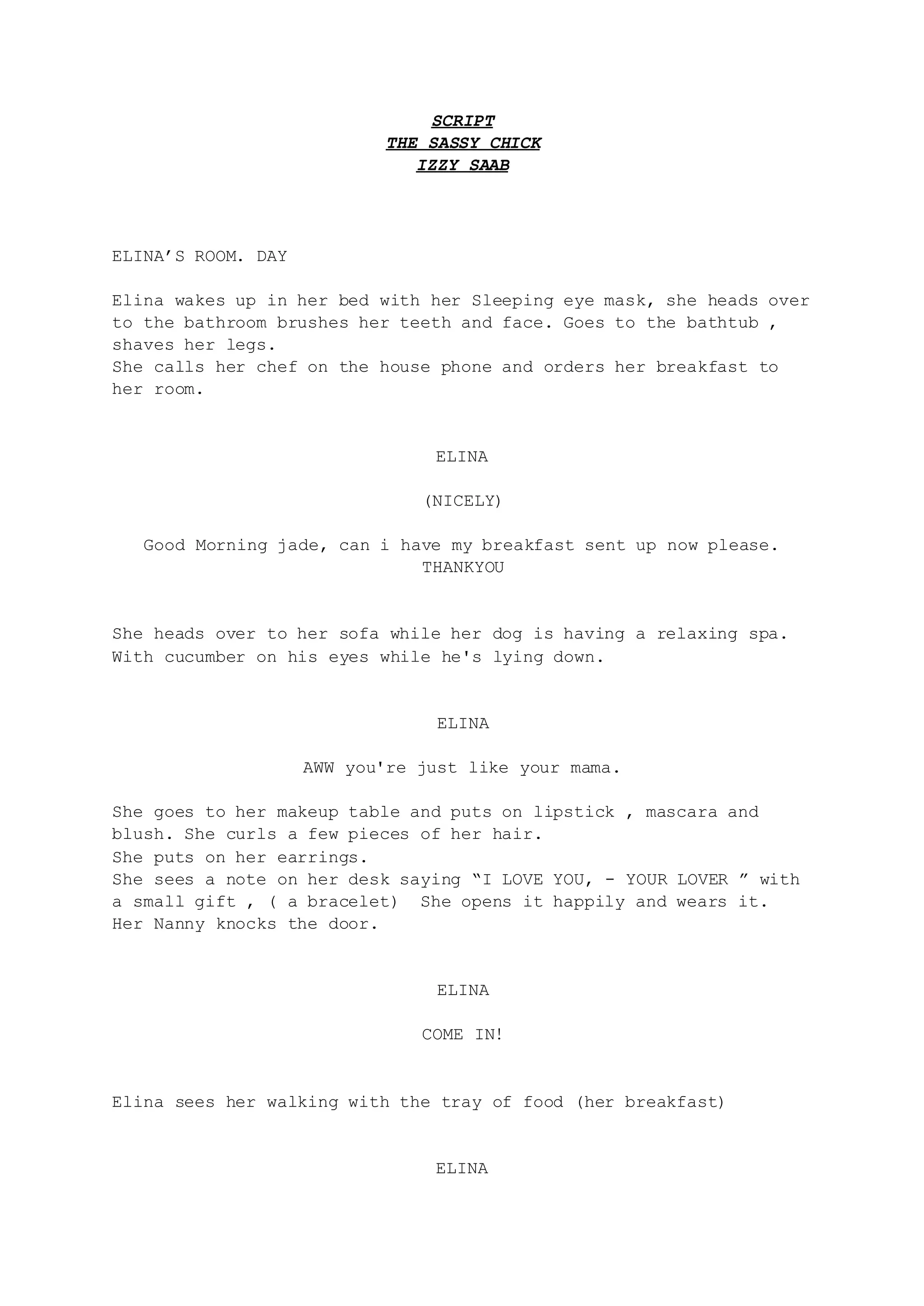Elina wakes up in her bedroom and gets ready for the day by brushing her teeth, shaving her legs, and ordering breakfast from her chef. As she eats strawberries and gets dressed, she receives a note and gift from her lover along with a text that he will arrive soon. When Justin arrives, Elina rushes off for fittings, having been distracted getting ready for the day in her luxurious bedroom.