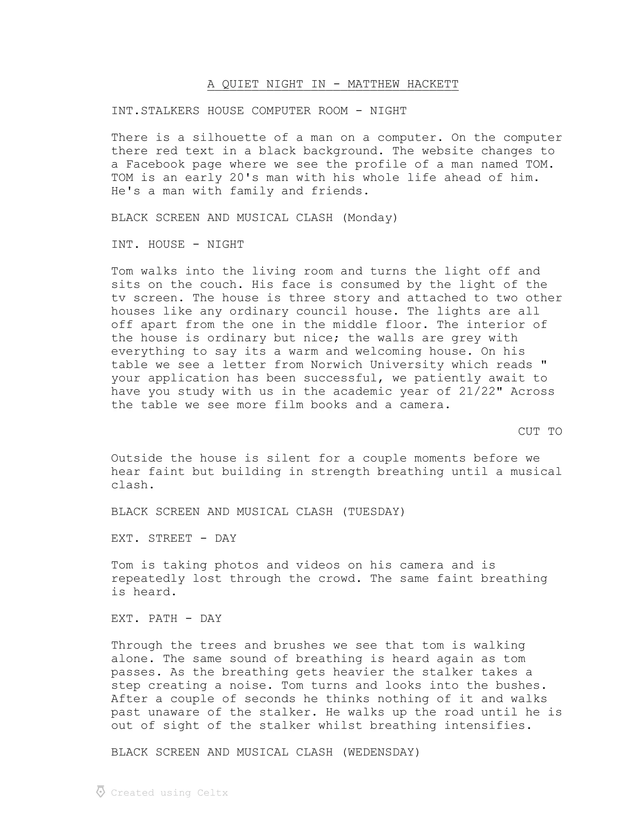 4) A loud scream and thuds are heard, implying the stalker has attacked Tom. The next night, the stalker uploads a video of Tom asleep to a website, suggesting
