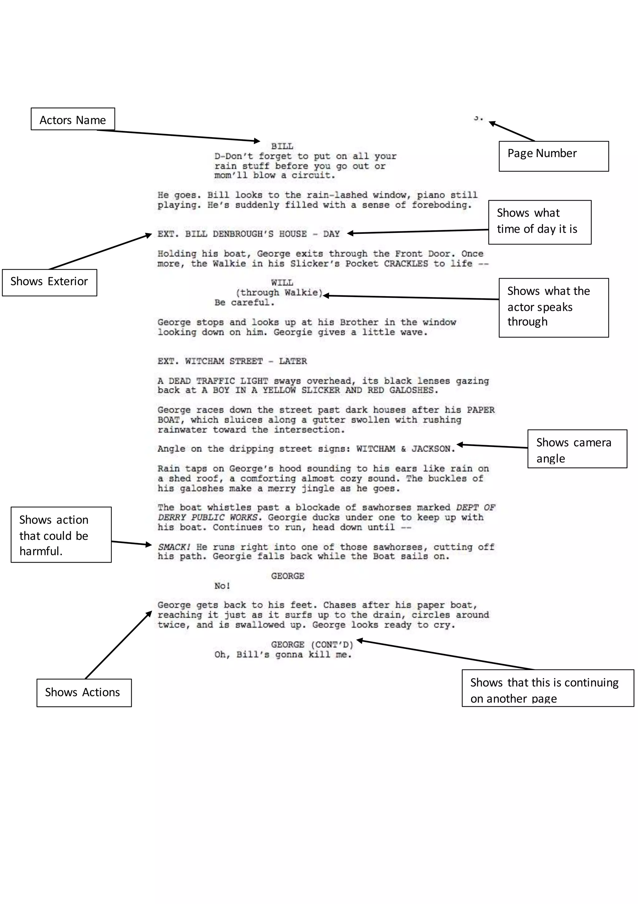 The document provides direction for filming a scene including showing the actor's name, exterior shots to establish time of day, actions, dialogue, camera angles, page numbers, potentially harmful actions, continuing to another page, camera movements, the actor's appearance, their point of view, the appearance of a clown, a location and time transition with title card, off-scene dialogue, and a new person entering the scene.