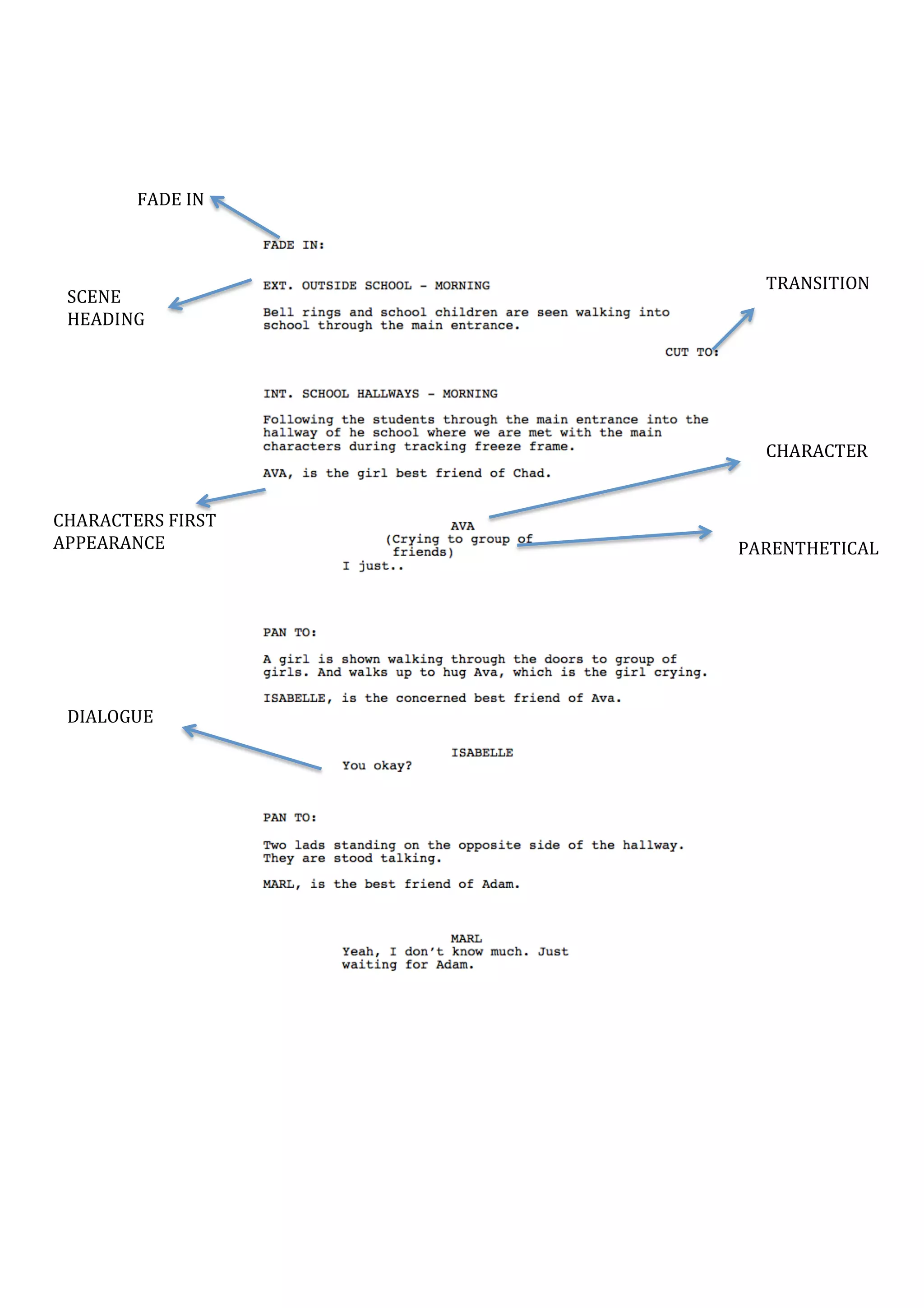 This document appears to be a screenplay format that introduces characters and sets up scenes with headings and transitions between locations. It uses common screenplay formatting conventions like scene headings, character names in caps, and parentheticals to provide character actions or context for dialogue.