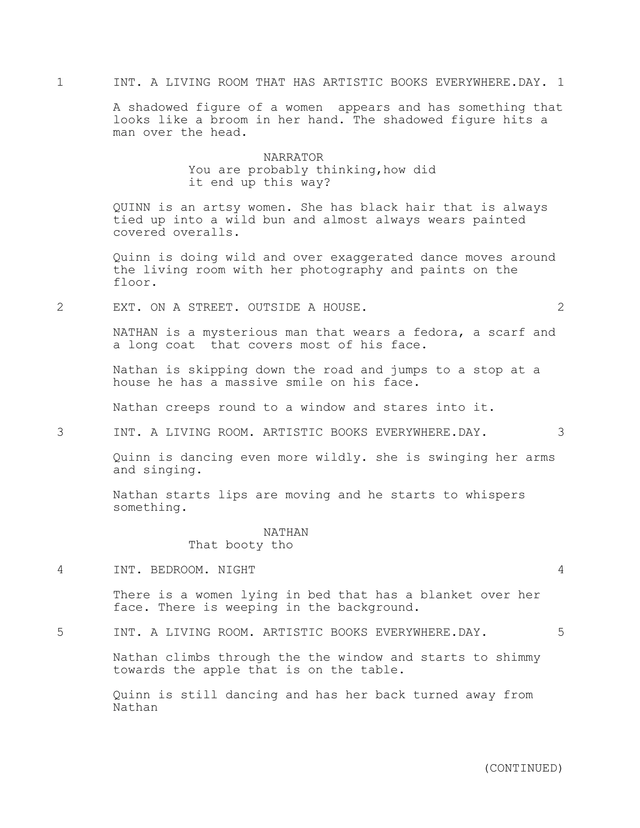 Quinn is an artsy woman who lives in a home filled with artistic books. She discovers a man named Nathan creeping around her home and biting into apples she leaves out. The next time Nathan enters her home without permission, Quinn hits him over the head with a broom. When Nathan wakes up confused, Quinn sits on his lap and promises to give him as many apples as he wants if he stops sneaking into her home and eating her apples without permission.