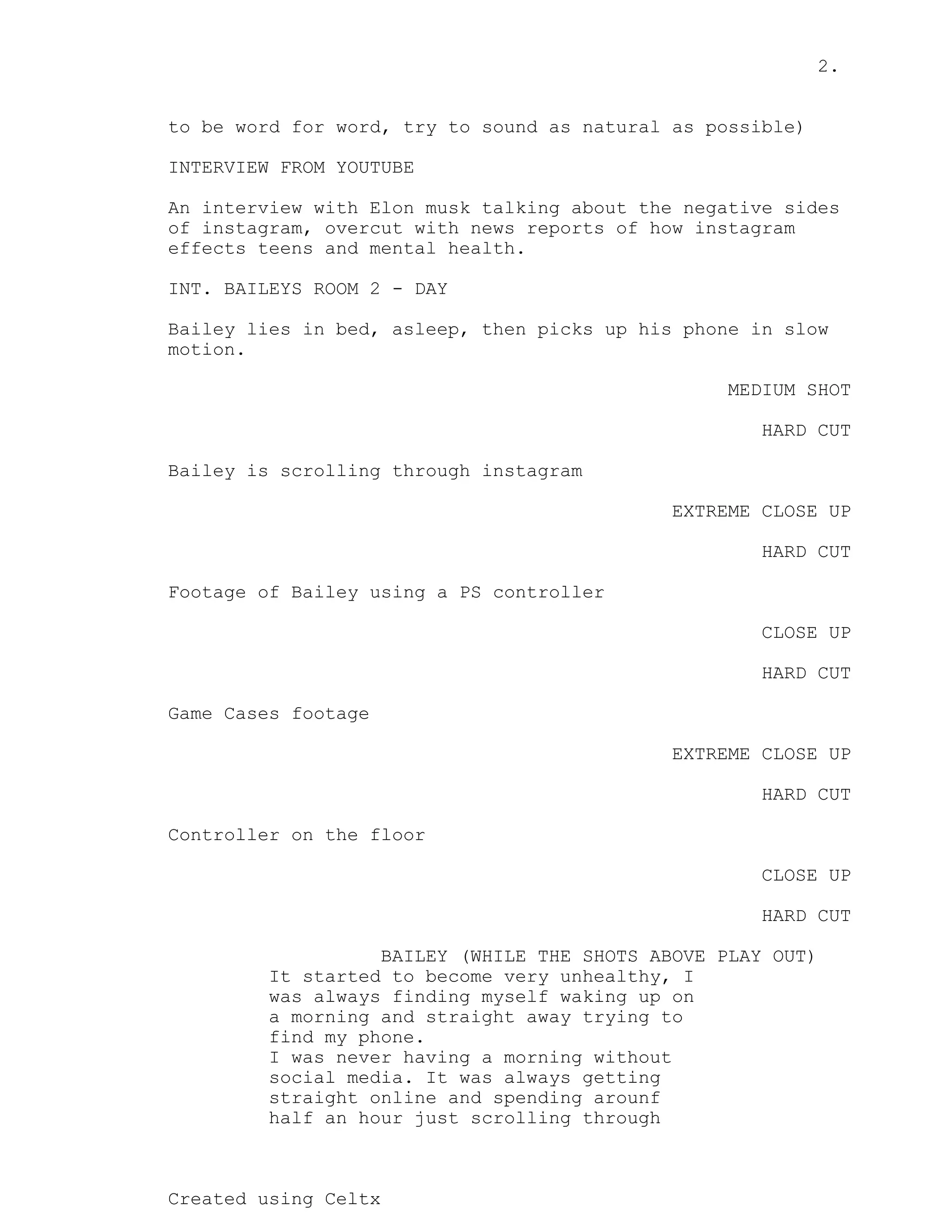 The document is a script that follows Bailey and his struggles with social media addiction. It shows how he would wake up and immediately get on social media, spending half an hour scrolling without relaxing. This caused him to game excessively and stop going out. However, the document also acknowledges that social media was used to spread awareness of important events like the George Floyd protests. Ultimately, Bailey decides to quit social media and finds other hobbies like skateboarding and walking in nature, which improve his mental health.