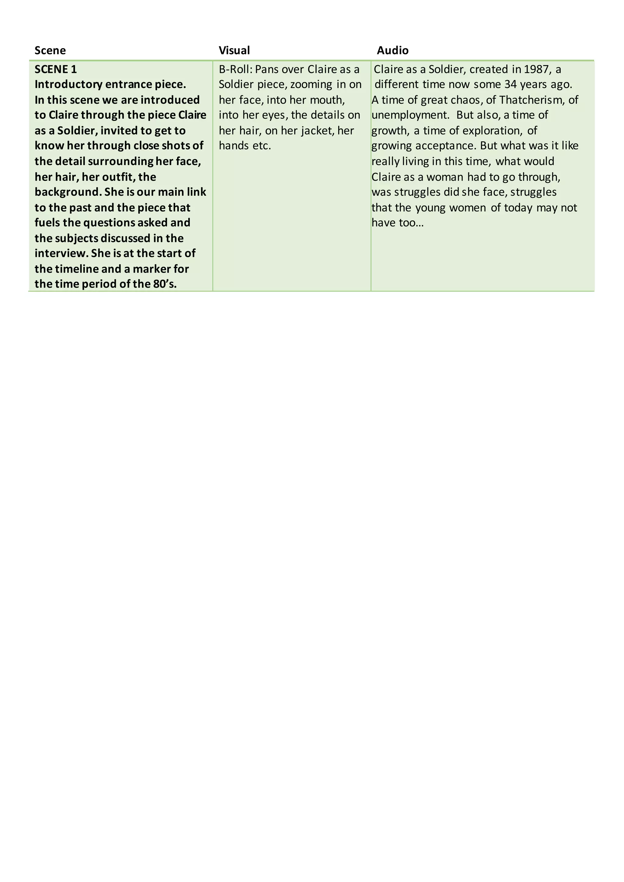The document is divided into three scenes introducing three women at different points in time: Claire from the 1980s, Emma who was a teenager in the 1980s and is now 50 years old, and Emma's daughter Madeleine who is currently an 18-year-old woman. Each scene includes visual b-roll of the subject and an interview where they discuss their experiences as a woman in their respective era, allowing comparisons across the decades from the 1980s to present day.