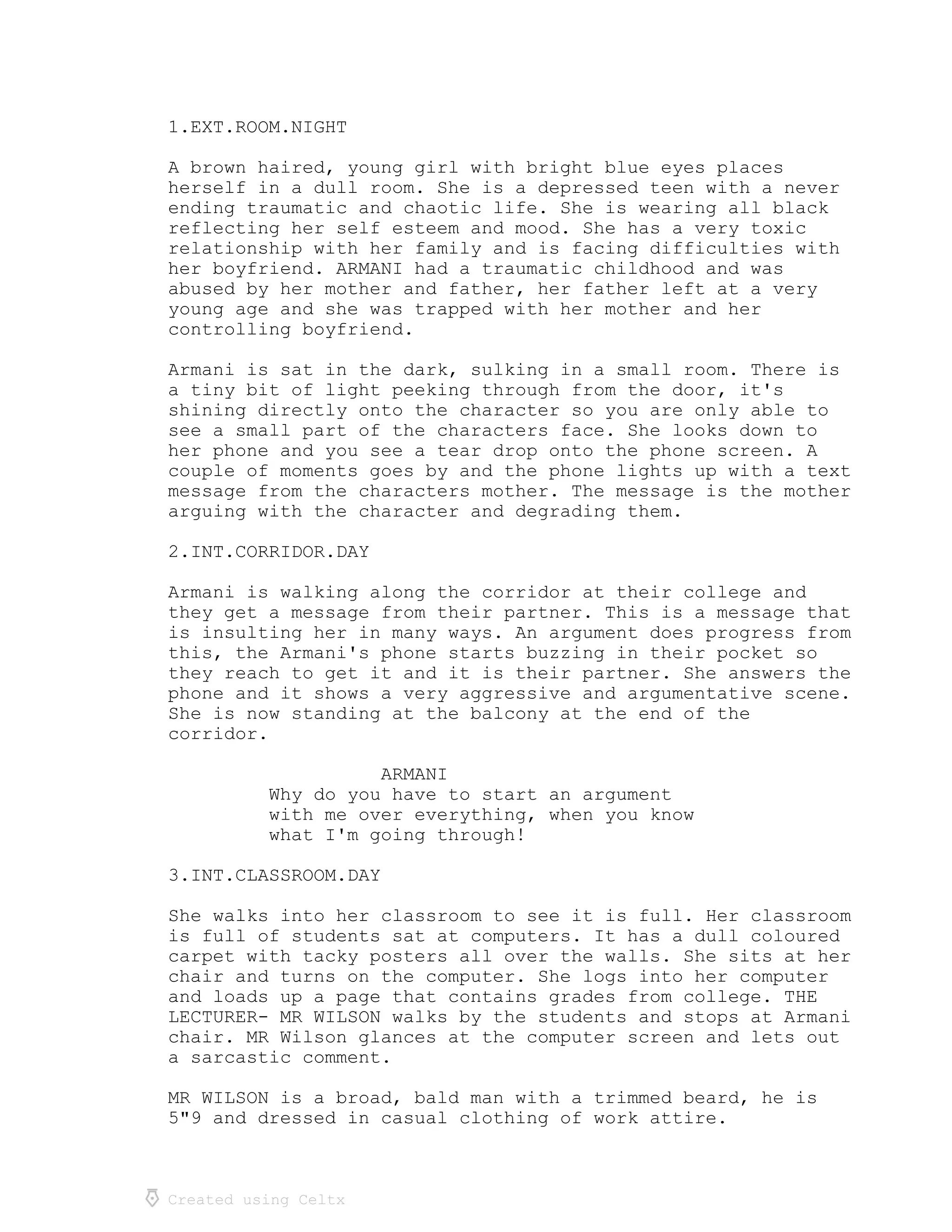 1) The document introduces Armani, a depressed teenage girl with a traumatic childhood who is being abused by her mother and her mother's boyfriend. She is struggling in school and having difficulties with her boyfriend.