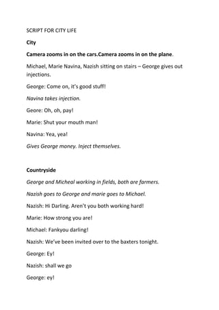 The document is a script that switches between scenes set in the city and countryside. In the city, George gives injections to others for money. Later, Michael stabs and robs Nazish. George and Nazish arrest Michael and Navina for drug use. In jail, Michael blames Marie for their imprisonment. The scenes set in the countryside show George and Nazish's happier rural life, where they discuss getting married, buying a house, and starting a family.