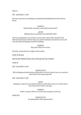 1) The two protagonists, Charlie and Jacob, are hiding from infected in an abandoned building. Charlie hears a noise and they realize the infected are nearby.