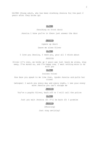 Jessica is in a state of panic with blood all over her after an altercation with her ex-boyfriend Oliver who has been stalking her for two years. When the police arrive at her house, Jessica is curled up on the floor crying and says she didn't mean to do it. Twelve hours earlier, Oliver confronts Jessica at her front door, grabs her and threatens her, saying he watches her every day. Jessica tells him to stay away or she'll call the police.