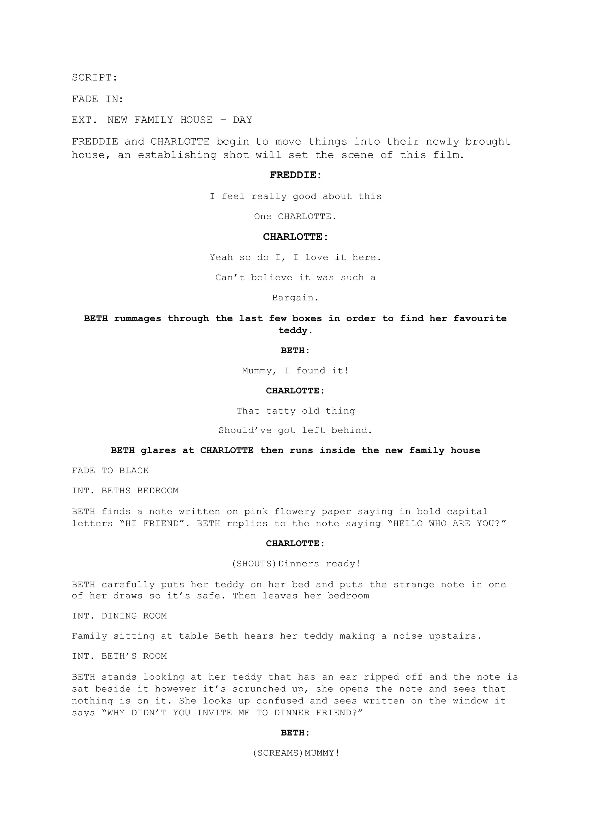 1) A family moves into a new house. Their daughter Beth finds strange notes in her room and her teddy bear is damaged.