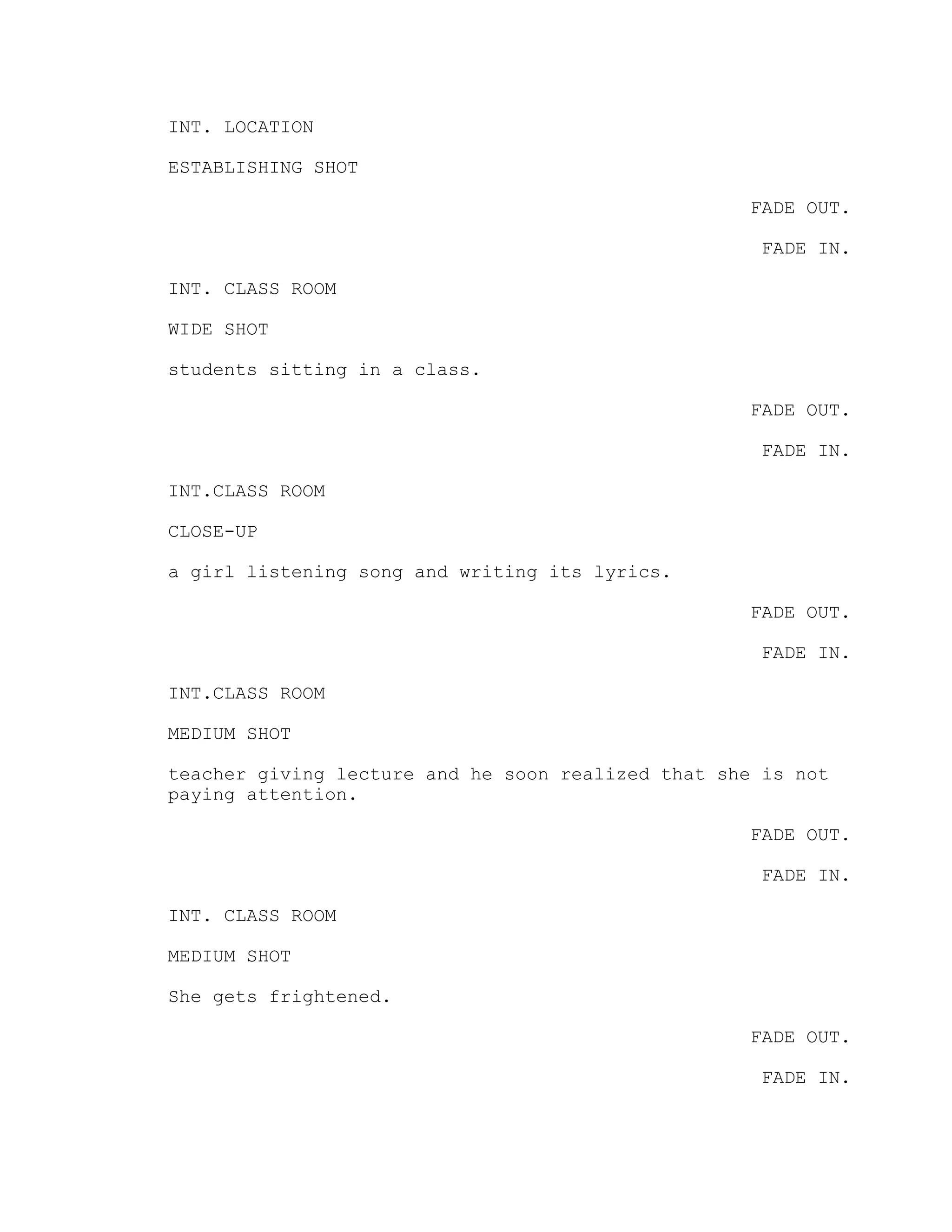 The document is a series of scenes depicting a girl in her classroom and at home. In class, she gets in trouble for not paying attention and is asked to leave. Outside class, she sees a poster for an upcoming singing competition and gets excited. At home, she tries to fill out the online form for the competition but becomes confused and worried about what others may think of her pursuing her dreams. Her mother then calls her to help with chores and she leaves her guitar behind in her room.